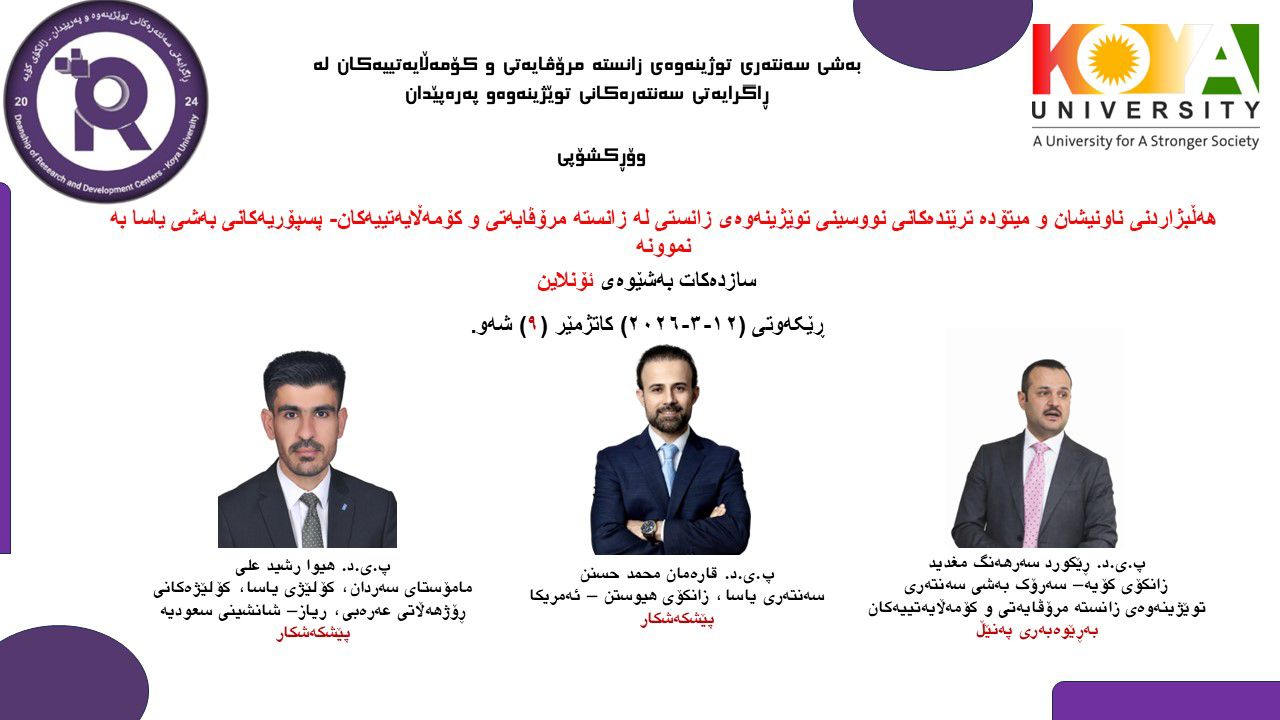 Supported by the second pillar, the Research and Innovation Pillar of the Strategic Plan of Koya University, the Department of Humanities and Social Sciences Research Center of our Dean’s Office conducted a workshop entitled “The Importance of Socio-Legal Approach in Understanding Law During Implementation” (Asst.Prof.Dr. Hiwa Rashid Ali) and (Asst.Prof.Dr. Qareman Mohammed Hassan), (Asst.Prof.Dr. Rekurd Sarhang Maghdid) Head of the Humanities and Social Sciences Research Center of our Dean’s Office conducted the workshop as the panel moderator.